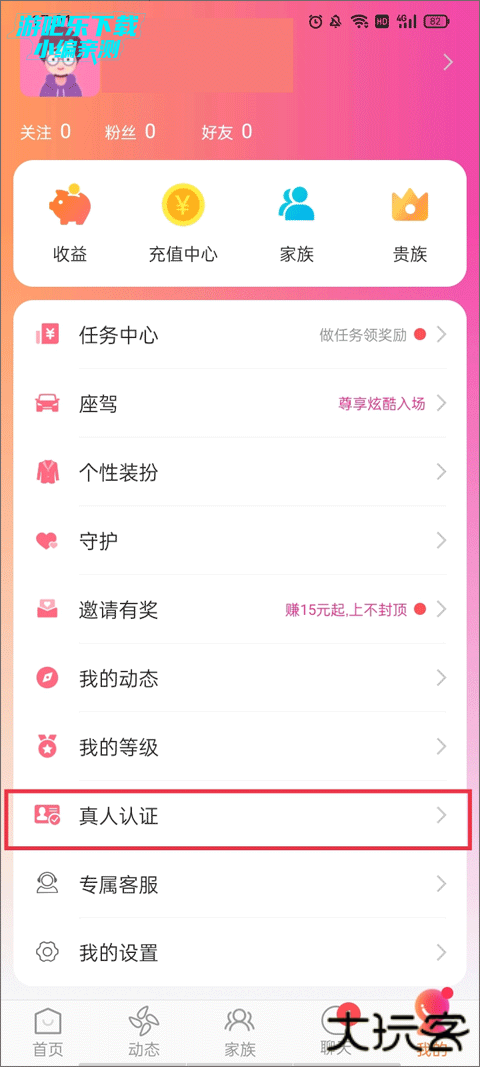 1、从【首页】切换到【我的】界面,点击下方的“真人认证”。