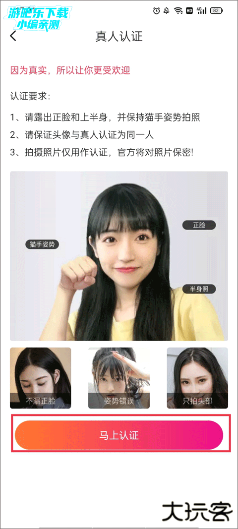 2、了解上方的认证要求,根据要求做出相对应的动作完成认证,点击马上认证。