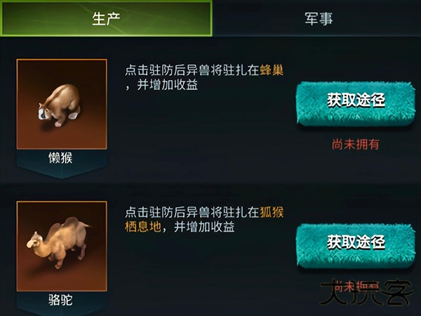 发展型异兽主要驻扎在领地从事生产、管理等内政建设。可以通过发展异兽栖息地建筑进行“驻扎”,驻扎之后会大大加速资源、部队的生产,其效果也是由该异兽的技能决定的。