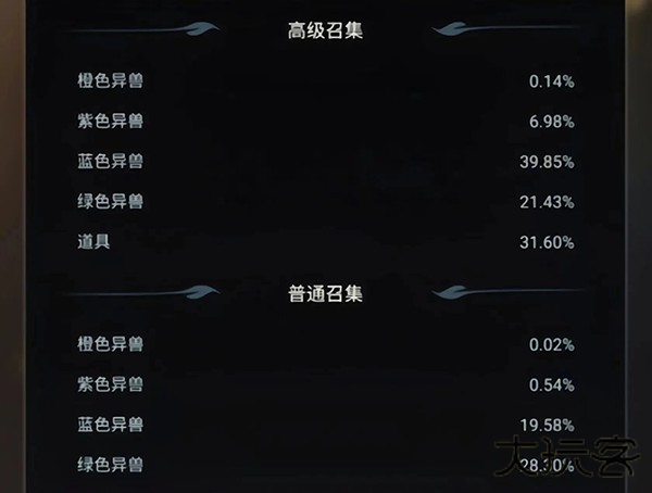 异兽根据强度依次递减为橙色、紫色、蓝色、青色。同一种颜色的异兽,没有绝对的强弱之分,但因其技能的不同,在实际战斗或组织发展中会有差异。