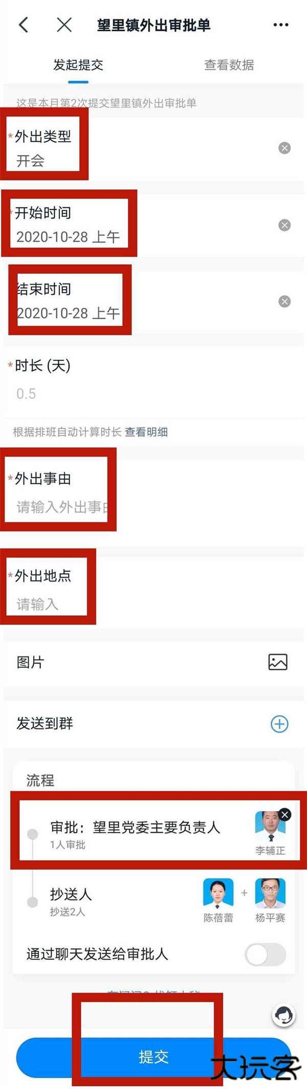 4、开会、出差、外勤等请选择《望里镇外出审批单》;事假、病假等请选择《望里镇请(休)假审批单》;如实填完信息后选择镇审批提交即完成,审批通过后,系统会自动更新考勤情况