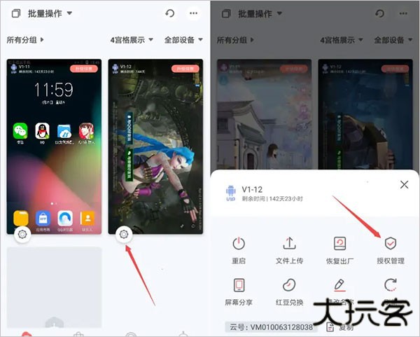 1、选择一台云手机,点击其预览视图左下角的齿轮图标,弹出云手机管理功能窗,点击授权管理。(注:切换成十六宫格预览视图时不会出现图标。)