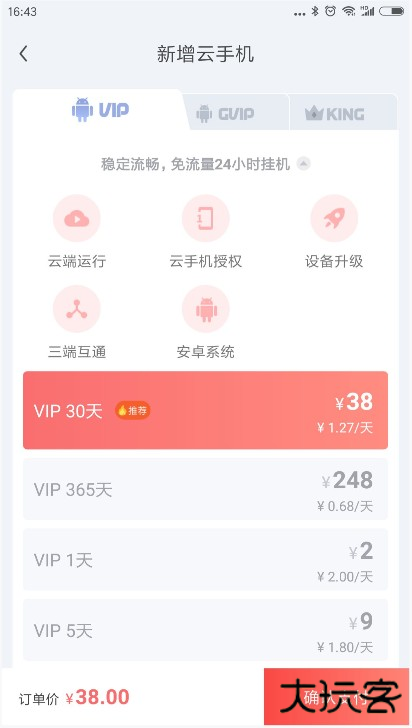 (注:VIP云手机30天套餐可选择使用百度钱包挂机续费,挂机续费则可节省三元。点击确认支付完成支付,点击确认。成功支付后用户主界面将增加一台云手机。