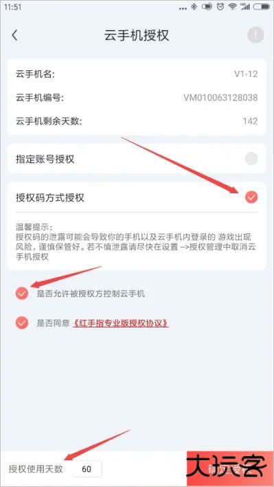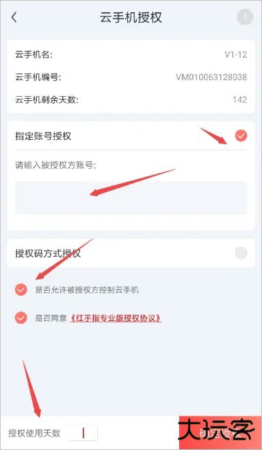2、进入云手机授权界面,可以选择指定账号授权或者授权码授权,将此云手机授权给好友。下面分别讲述操作方法。——云手机授权方式一:指定账号授权如果选择指定账号方式授权,在下方框填写被授权方的红手指账号,勾选授权的权限(是否允许对方控制云手机),填写授权使用天数;