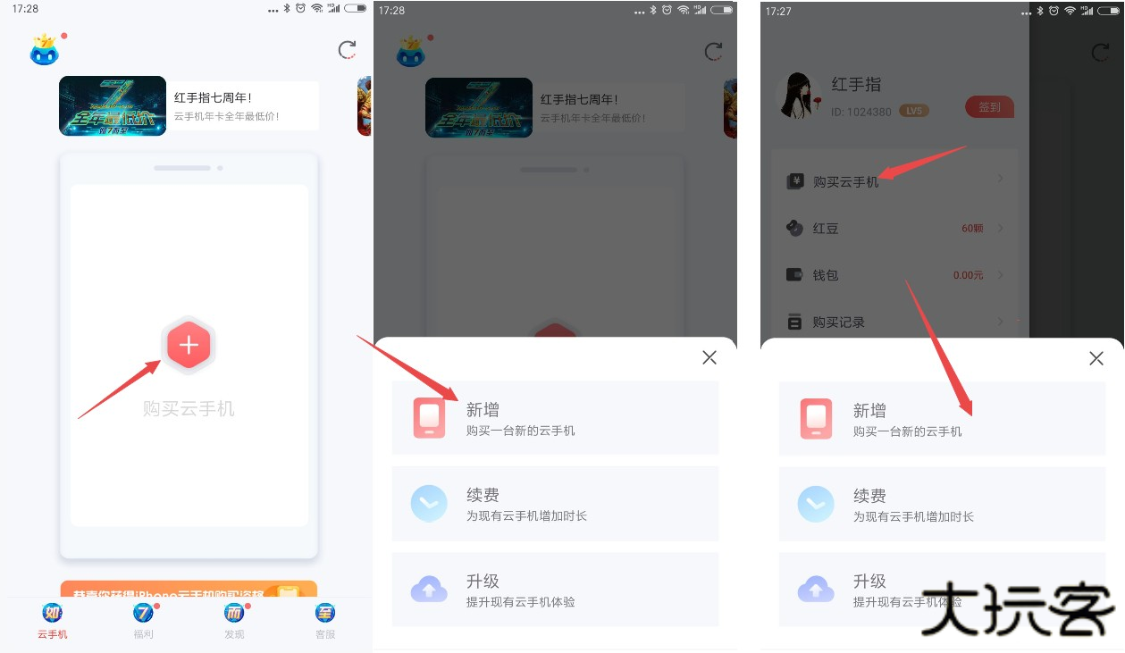 1)登录进入红手指云手机安卓版APP,在主界面后点击“+”号,弹出云手机新增/续费/升级功能栏,选择新增云手机;