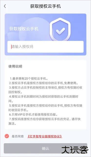 3、在获取授权云手机界面,输入正确的授权码,仔细阅读《红手指专业版授权协议》后,点击确认即可获得对应云手机的使用权。