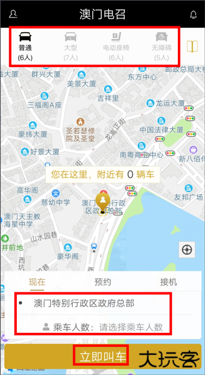2、进入app后,根据自己的出行人数,选择打车类型,然后设置出行终点,点击【立即叫车】即可为你打车。