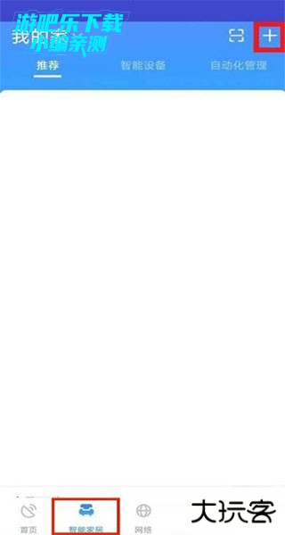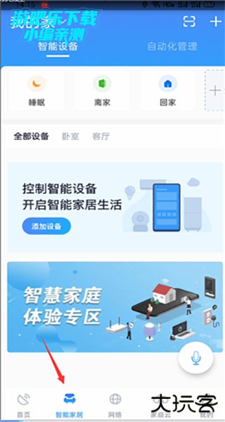 1、打开软件,在下面的菜单栏里面找到智能家居,点击进入智能家居标签页;