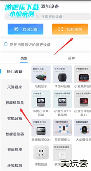2、点击添加设备,选择智能机顶盒,扫码绑定机顶盒;