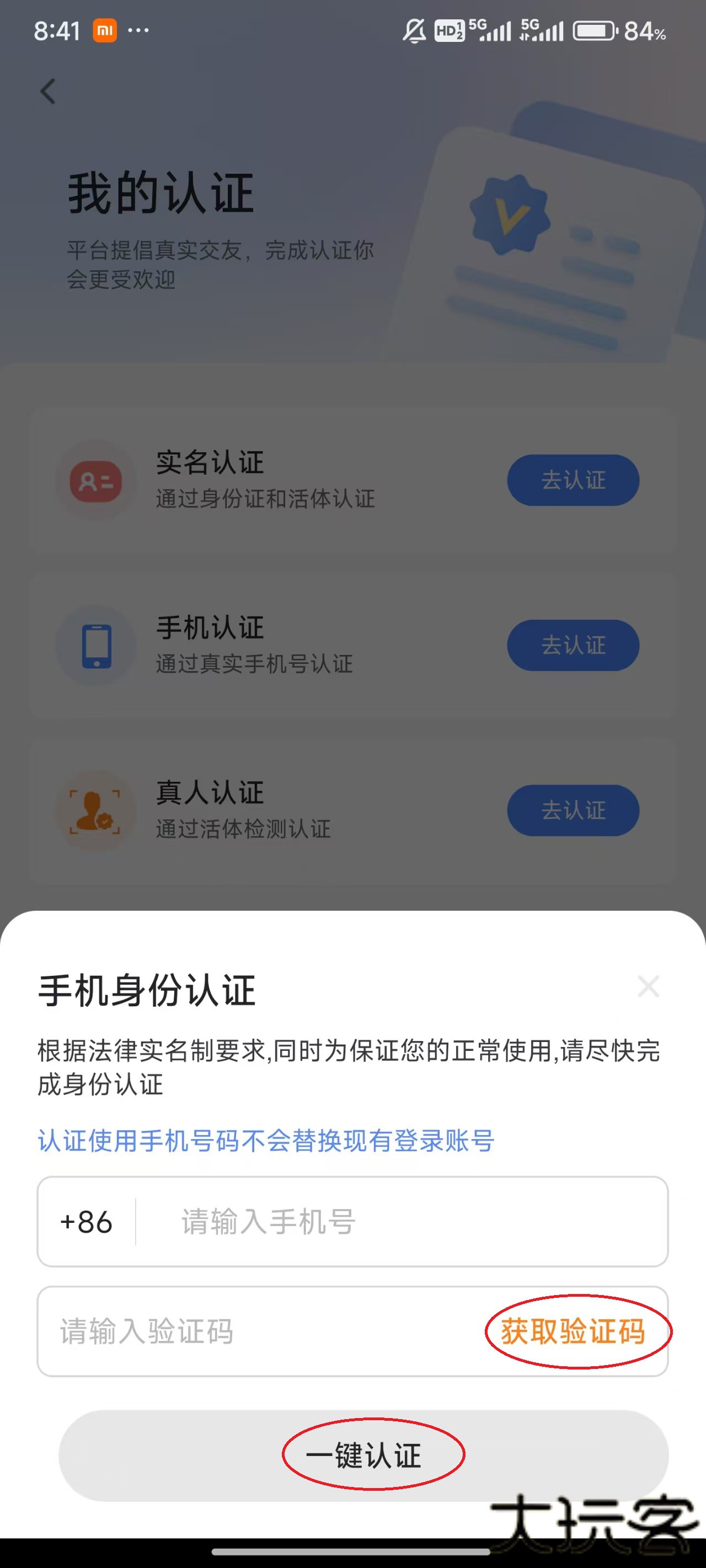 5、手机认证,输入手机号,点击“获取验证码”,输入验证码后,点击屏幕下方的“一键认证”。