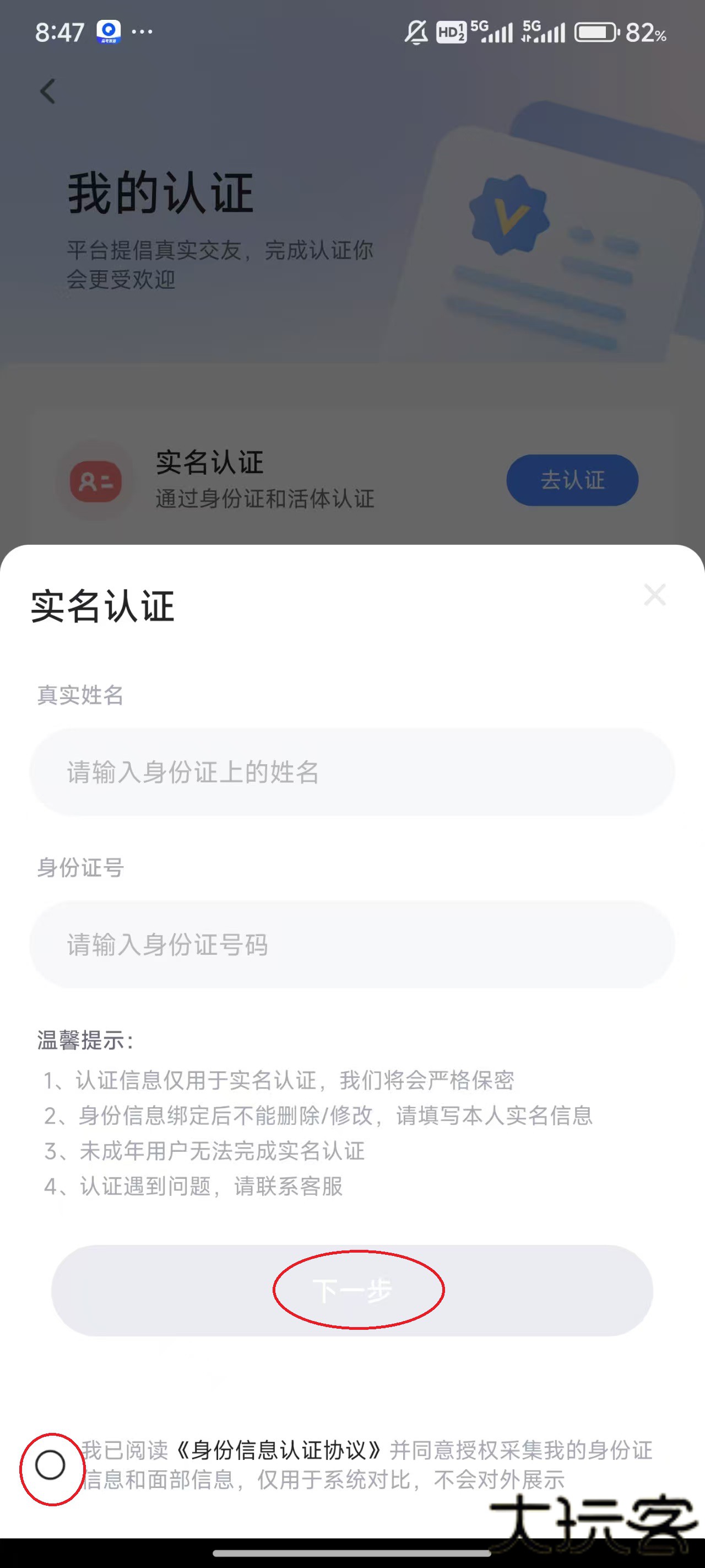 4、实名认证,输入相关信息,勾选最下方的“我已阅读”,随后点击“下一步”,完脸识别就行了。