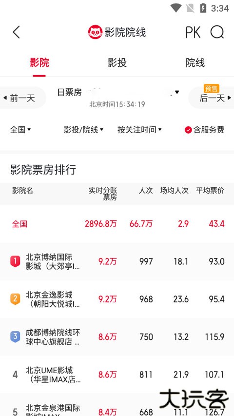 2、它为用户提供了综合影院票房排名,用户也可以按照票房又高到低、人次又高到低、上座率由高到低等进行排名;