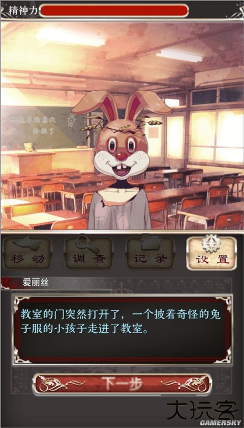 调查所有能调查的地方,先调查书包,然后拿走爱丽丝的学习工具,来到讲台拿走上门的纸,调查模式下选择【思考】,进入剧情。