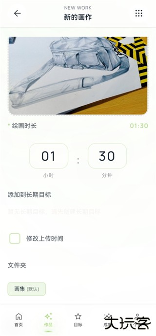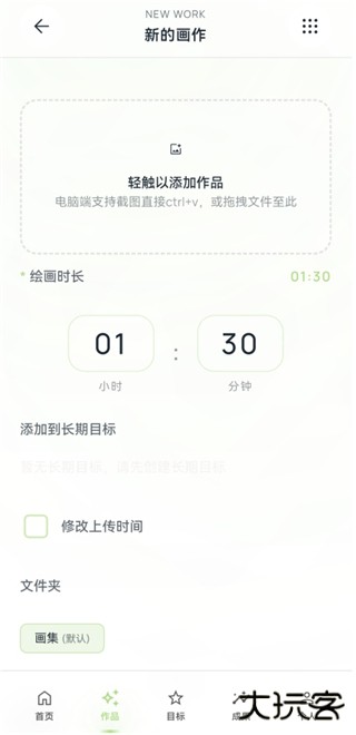 2、点击上方虚线的区域添加作品,你可以设置绘画时长。