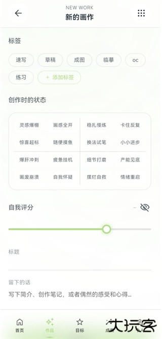 3、滑到最底下可以给这张画添加标签、创作时的状态、自我评价、标题等内容,都设置好后点击保存。