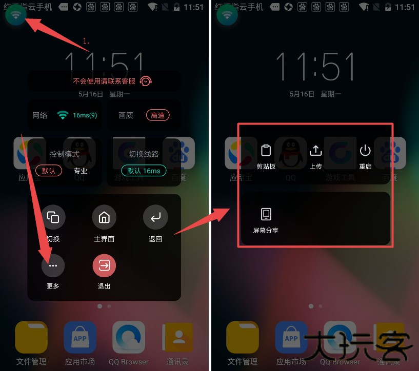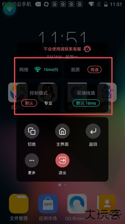 1、点击虚拟安卓云手机桌面的悬浮功能窗,即可呼出虚拟云手机功能操作菜单,包括切换控制模式、画质、线路等多重功能。默认模式下云手机功能悬浮窗始终置顶悬浮在最顶层。