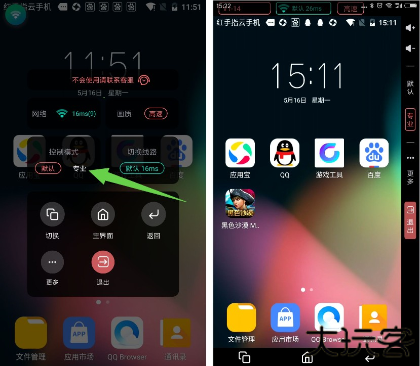 4、虚拟云手机控制模式切换专业模式后,云手机控制功能菜单栏呈现方式将发生变化,操作更快捷方便,具体变化如图。