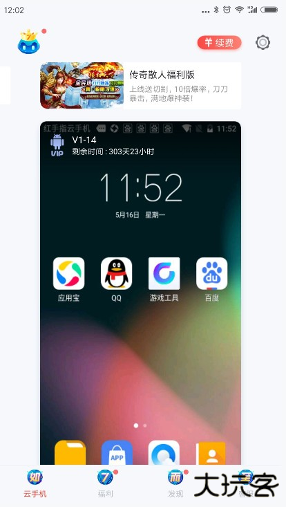 点击上图中的“退出”按钮,可以退出虚拟云手机,返回红手指APP主界面,即云手机类表界面。