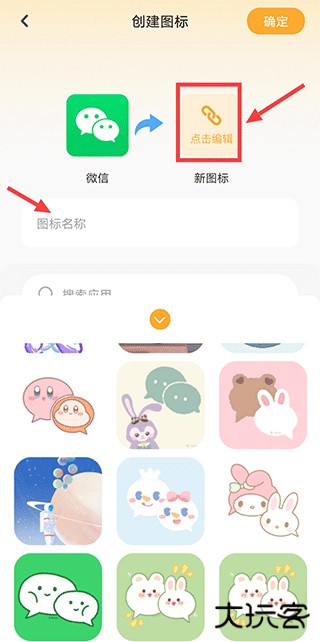 2、接着先输入图标名称,再点击右侧图标在下方选择自己喜欢的图标,选好点击确认即可。