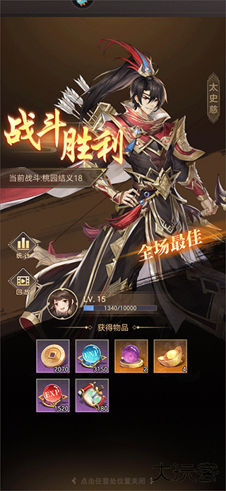 3、战斗结束后,如果想回看刚才的战斗过程,也可以点击回放,进行观察研究。点击统计,可以看到武将在战斗过程中的输出或治疗等数据。