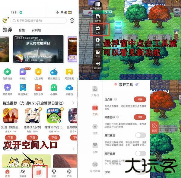 在双开空间打开游戏后点击双开悬浮窗就可以看见工具栏,点开就可以看见这次更新的新功能了