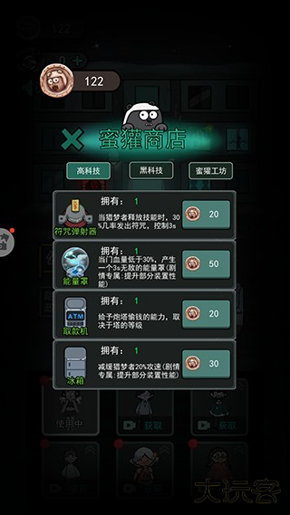 点击右上角的蜜獾商店,在里面不断升级自己的属性,这样可以让玩家在下次游戏的时候可以获得额外的攻击以及防御属性,这样就可以轻松的面对猛鬼的攻击了。