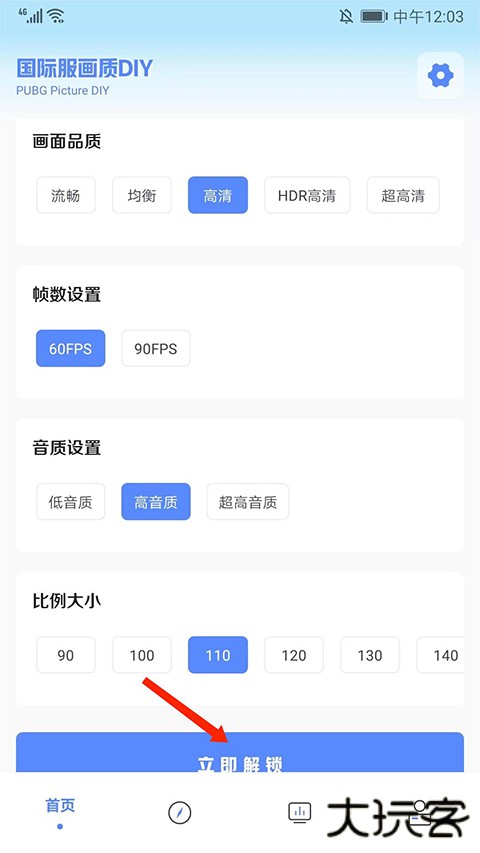2、滑动屏幕,用户可进行画质品质、帧数设置、音质设置以及比例大小的调整,选择好相应的设置后,点击【立即解锁】选项。