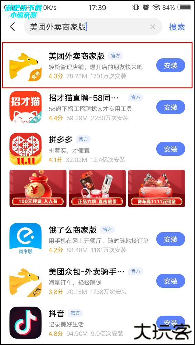 ①在手机应用商店搜索“美团外卖商家版”APP下载安装,如图1所示。