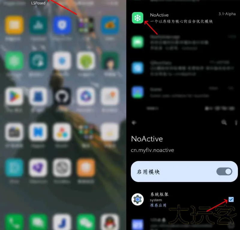 1.打开LSPosed启用NoActive模块勾选系统框架
