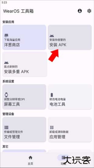 1、因为app它是属于手表上的app,所以如果想要安装它需要借助第三方工具来进行安装。在手机上下载wearos工具箱,并连接至我们的智能手表,然后点击下方的功能选项。