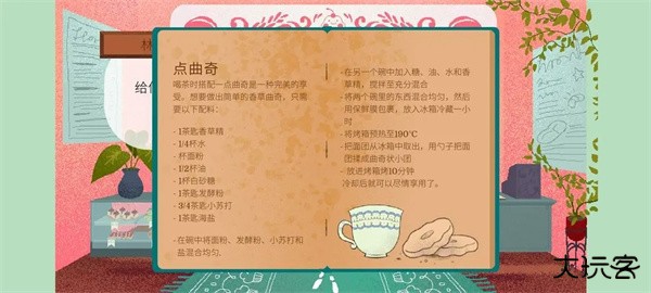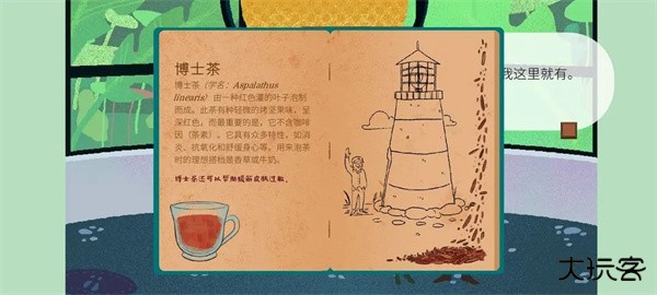 餐桌上拿到《茶叶百科》,出门直走猫头鹰奥托处拿到《地图》。