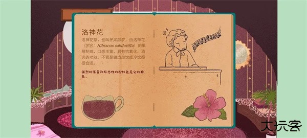 【广场】找女巫安多拉占卜,得到“地下”和“粉色”的线索,粉色即对应洛神花(线索在茶叶百科中有提到),