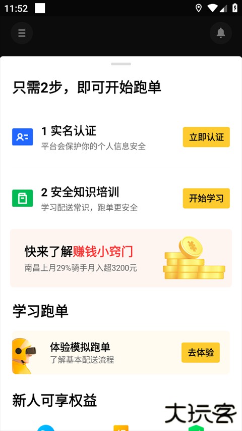 3、选择玩工作地址后就差两步就可以跑单了,第一步填写身份认证信息,主要上传身份证明,第二步则需要你将安全知识培训学完。这样就可以接受跑单了。