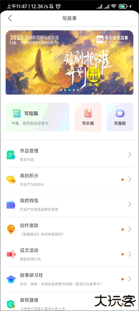 3、在这可以看见很多有关写文章的活动和功能,这个时候我们根据自己的文章点击,若你是短篇文章就直接点击短篇就行,如果你写的是长篇的小说点击写长篇就可以了,小编现在就以短篇为例。