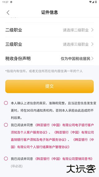 5、填写证件信息,并且同意软件所有协议,点击【提交】即可,稍后会有韩亚银行客户经理与您联系,请耐心等待