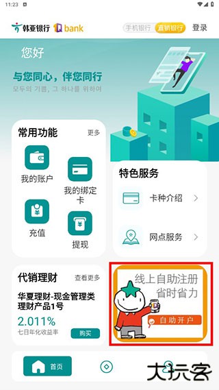 1、从本站下载韩亚银行app中文版手机客户端,安装后进入应用,在首先点击【线上自动注册省时省力】进入