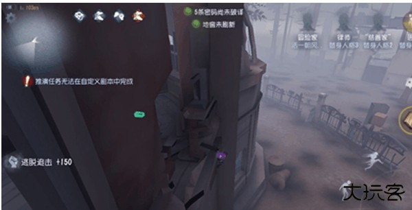 在这里我们可以看到冒险家缩小后,可以卡在墙壁外面的半空,蹲下的话监管者是打不到你的,可以完美和墙壁结合在一起(应该不算是BUG吧~),不过想要卡对位置要费好大劲,感兴趣的可以试试哦。