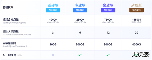 目前有基础版、专业版、企业版、旗舰版四种套餐,收费标准如下表