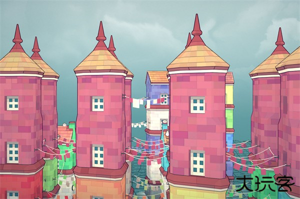 彩旗会在间隔1或者2个空间间隙的2层及以上建筑物之间生成,建筑物需满足上一层建筑基块与下一层的颜色不同。