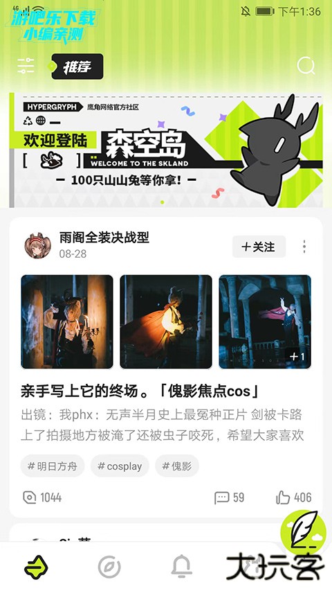 1、打开森空岛游戏社区软件,进入主界面,可看到玩家们分享的游戏资讯和游戏攻略,