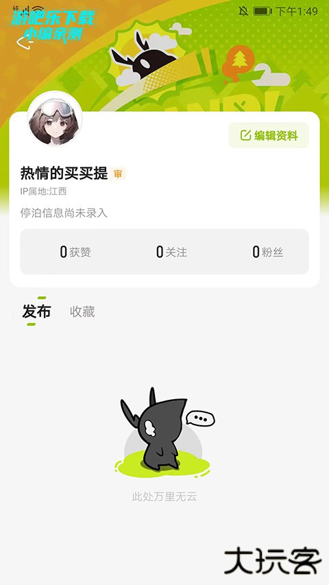 5、进入个人中心,可以查看详细的获赞数、发布数、关注数、粉丝数和收藏数等内容,还可以编辑用户资料,