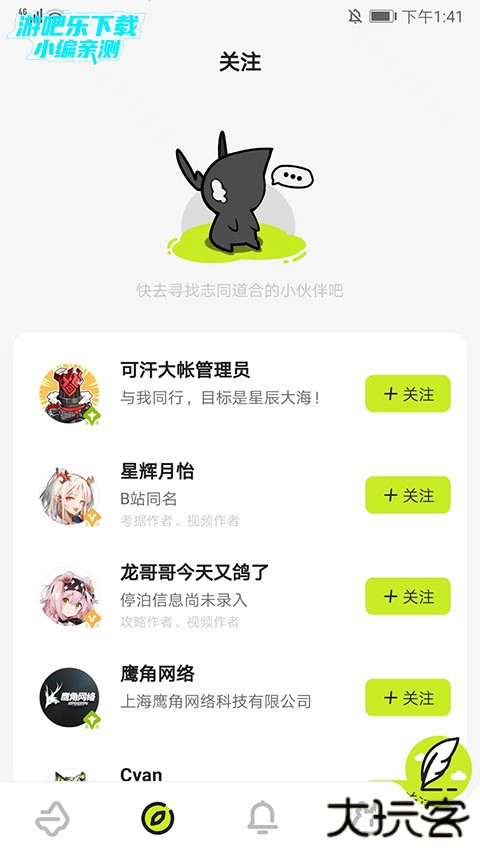2、进入关注界面,可看到当前关注的用户,也可以选择画师、视频作者、攻略作者等用户关注,
