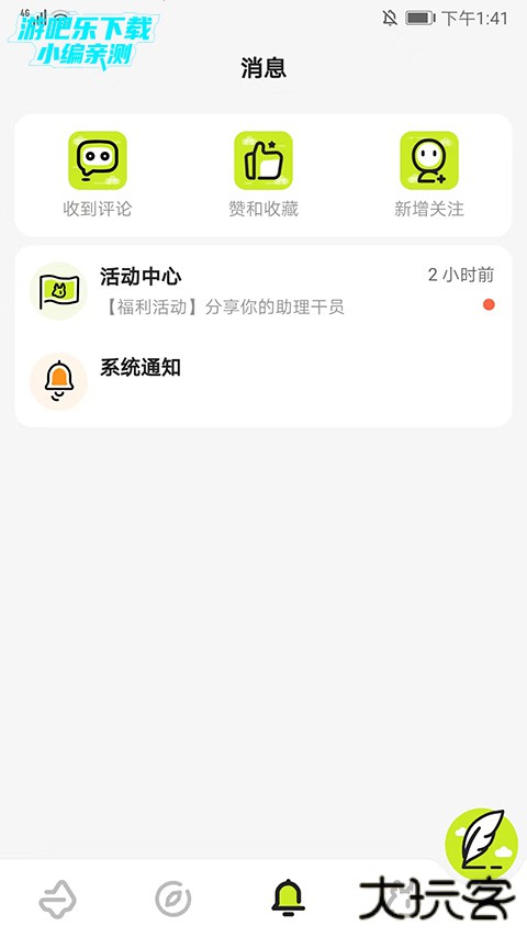 3、进入消息界面,可查看评论、赞、收藏和新增关注的消息提示,