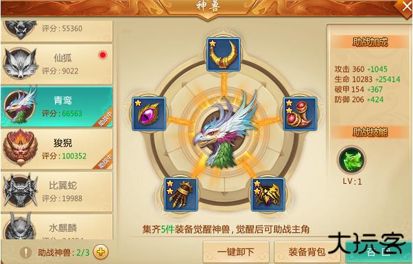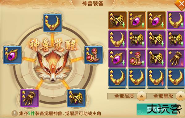 玩法介绍:系统有多个神兽,每个神兽都有5个装备栏,分别为:兽角、獠牙、鳞甲、兽爪、兽眼;每个部位都有一定的穿戴品质要求,集齐5件装备可觉醒神兽,觉醒后可助战主角。
