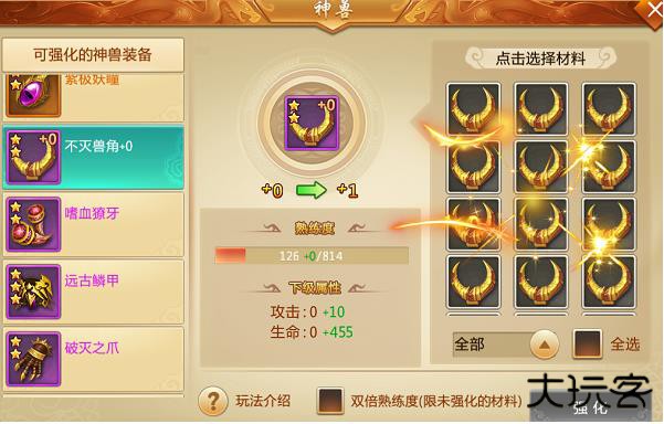 2、强化时选择其他装备或【兽血灵晶】作为强化材料,当熟练度满时自动升级,获得强大的属性加成