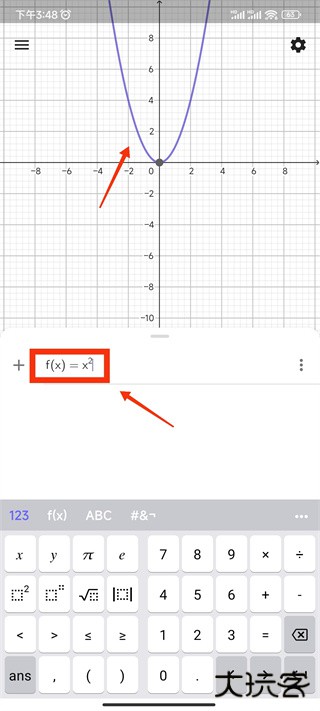 4、接着直接在加号图标右侧进行输入,这里我们输入f(x)=x²函数,输入之后可以看到图中出现了相应的图像;