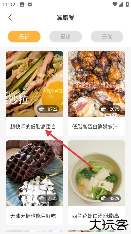 2、减脂餐板块界面顶部有最新、最热、最优分类标签,可切换筛选不同排序的减脂餐内容,点击喜欢的菜品进入烹饪教程页面,助力用户轻松做出适合减脂期的美味佳肴。