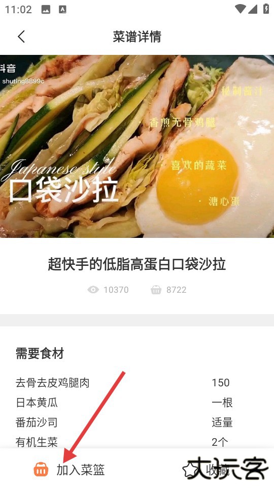 3、菜谱详情页展示菜品图、名称、浏览及收藏数,底部有加入菜篮和收藏按钮,用户点击加入菜篮按钮,即可将该菜谱食材添加至APP菜篮,方便用户集中采购。