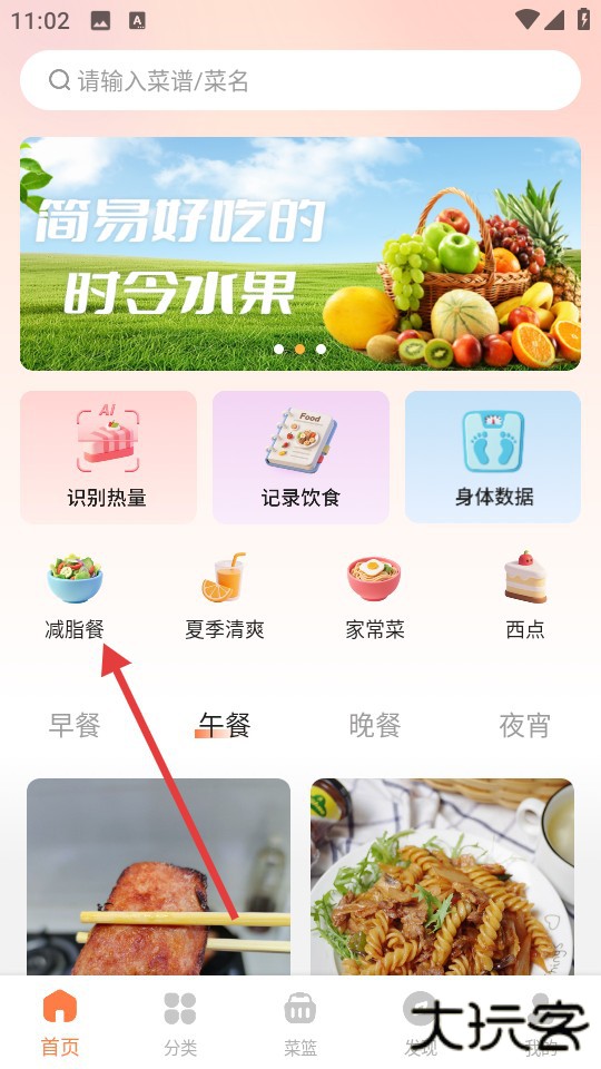 1、在懒人食谱首页,设有识别热量、记录饮食等实用工具,还有减脂餐、家常菜等分类入口,首先可以点击减脂餐能进入对应专栏,获取低卡的减脂菜品教程。
