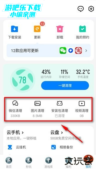 其他清理都是同理的,如果为了方便,也可以点击“我的”里面的“一键清理”;